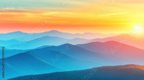 Soft hues of orange and blue fill the sky as the sun rises over tranquil mountains, creating a serene morning landscape. Generative AI