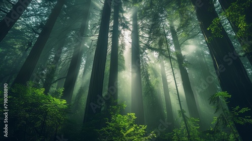 Soft light filtering through a canopy of towering redwoods, the fog adding a mystical quality to the lush, green forest understory