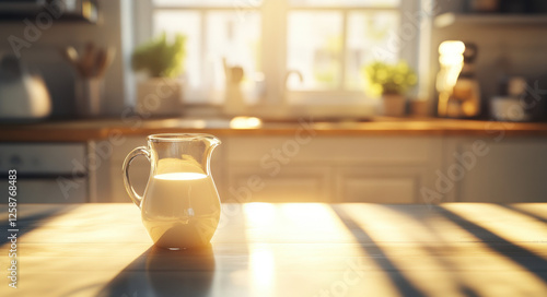 Soft morning light streams through windows, illuminating a glass jug of milk placed on a wooden table in a cozy kitchen