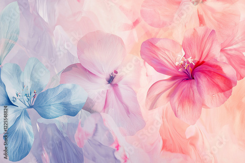 Soft pastel floral composition featuring blue and pink flowers with a dreamy background