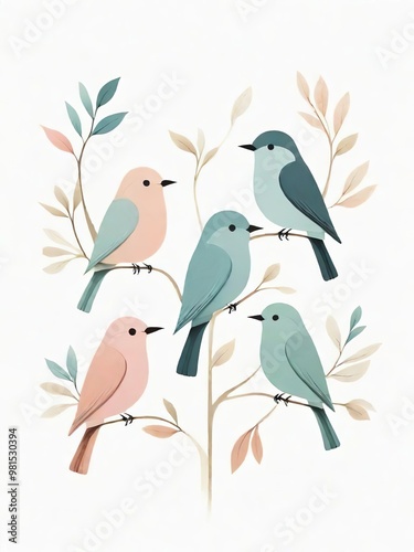 Soft, pastel illustration of birds perched on delicate branches, perfect for adding a touch of nature and calm to any space. Ideal for modern, minimalist interiors with a natural vibe