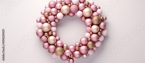 Soft pink and beige ball wreath on a white wall Elegant festive decoration for seasonal celebration Holiday decor inspiration