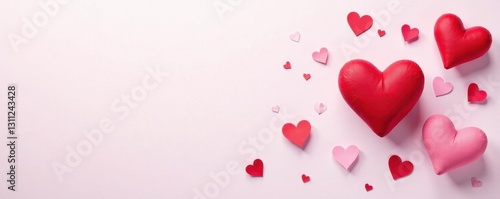 Soft pink and red hearts scattered on a white background, illustration, background, valentines