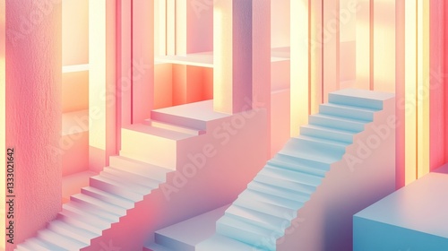 staircase, stair, architecture, design, pink, pastel, geometric, abstract, light, shadow, building, column, modern, minimalist, structure, indoor, line, perspective, block, step, pattern, interior, level, construction, ramp, gradient, ascent, climb, hallway, surreal
