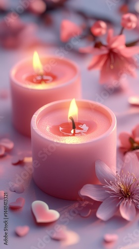Soft pink candles with heart decorations create a romantic atmosphere for a cozy evening of relaxation