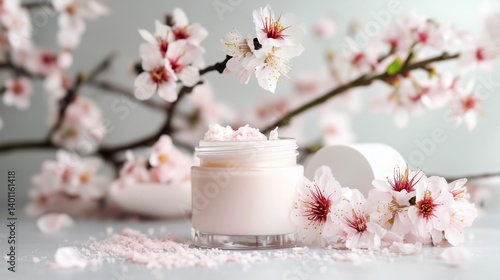 Soft pink cream near delicate cherry blossoms on a smooth surface during daylight hours
