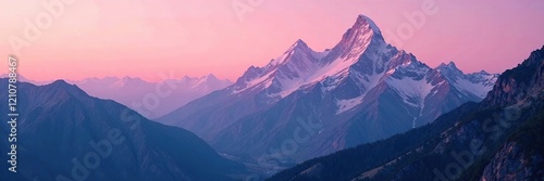 Soft pink dawn breaks over rugged mountain peaks, landscape, mountains