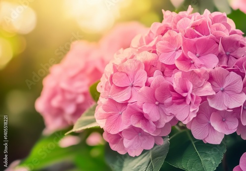 flower, pink, hydrangea, bloom, nature, garden, botanical, floral, sunlight, soft, vibrant, closeup, beautiful, seasonal, fresh, greenery, colourful, blossom, tranquil, serene, natural, summer, landscape, relaxation, decoration, aesthetic, photo, background, elegance, macro, detail, lush, environment, plant, organic, cheerful, peaceful, growth, high-coloured, colours, spring