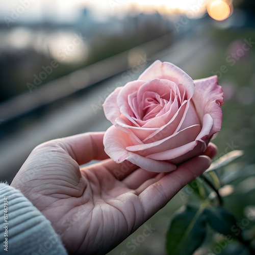 Soft Pink Rose Held in Hand: Gentle, Romantic, Sunset Light