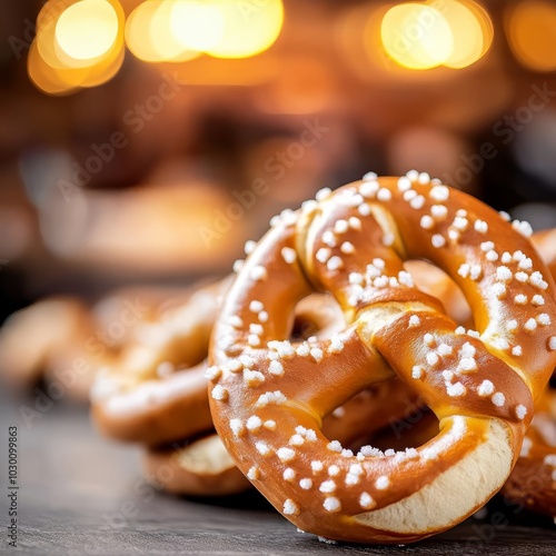 Soft pretzels with salt under a warm light, bustling crowd, street food snacks, classic snack
