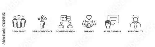 Soft skills banner web icon vector illustration concept for human resource management and training with icon of team spirit, self-confidence, communication, empathy, assertiveness, and personality
