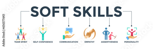 Soft skills banner web icon vector illustration concept for human resource management and training with icons of team spirit, self-confidence, communication, empathy, assertiveness, and personality