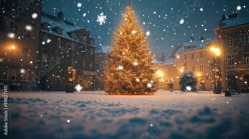 Soft snowflakes swirling gently around a glowing Christmas tree in a snow-covered town square.