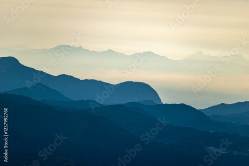 mountain, hill, dawn, mist, landscape, sunrise, nature, calmness, beauty, layered, serene, fog, atmospheric, outdoors, travel, scenery, exploration, adventure, peaceful, soft, light, vacation, get-away, hiking, scenic, view, elevation, quiet, natural, wilderness, semitropical, weather, perspective, distant, formation, colours, horizon, terrain, wildlife, environment, sky, panorama, peak