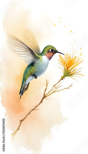 Soft watercolor painting of a delicate hummingbird sipping nectar from a bright blossom, creating a dreamy and serene atmosphere with fluid brushstrokes and pastel tones