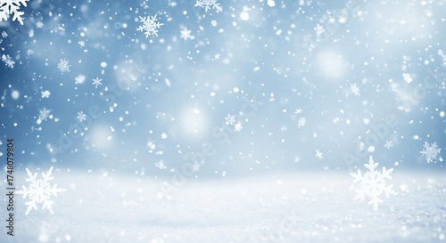 Soft winter snowfall bokeh lights gentle blue backdrop for festive designs