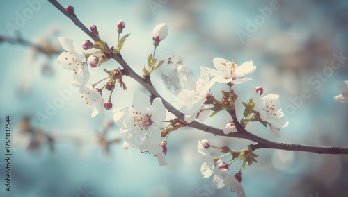 Soft-focus spring background with blooming bird-cherry branches in pastel vintage blue hues