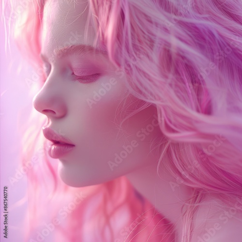 Soft-Focused Portrait of a Young Woman with Pink Hair and a Serene Expression