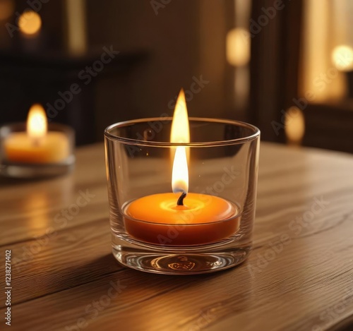 Softly glowing amber candle in a glass holder on a wooden table, soothing ambiance, relaxing ambiance, soft glow