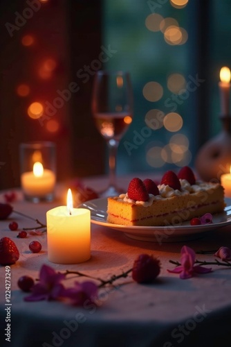 Softly glowing candlelight on a romantic dessert table, evening, warm lighting