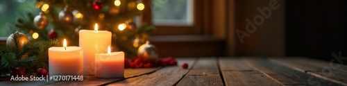Softly glowing candles and Christmas tree on wooden table, Christmas tree