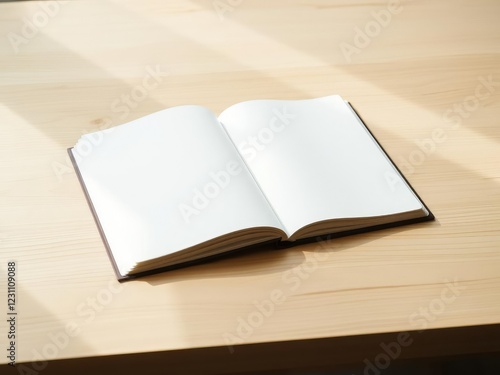 Softly glowing fresh diary pages sitting on a minimalist wooden desk with a single natural light source, office supply, paper texture, diary