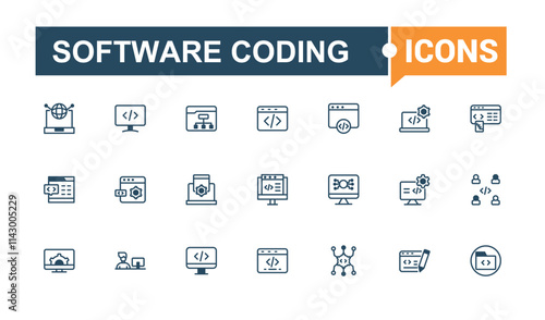 Software Coding icon set. Featuring binary, programming, java, computer, application, algorithm, work, technology. Perfect for logos and infographics. Solid line editable stroke.