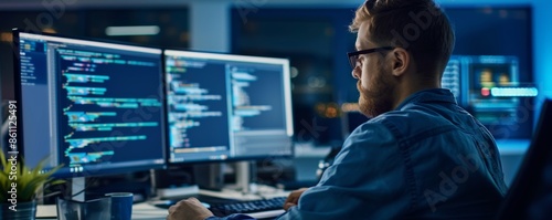 Software developer focused on computer screens with code. Programming, coding, and developing software in a modern office environment.