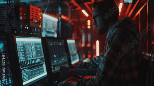 Software Developer in casual clothing wearing headphones and updating server system database in a dark research facility.