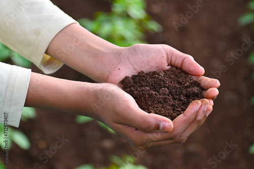 Soil in hand, palm, cultivated dirt, earth, ground, brown land background. Organic gardening, agriculture. Nature closeup. Environmental texture, pattern. Mud on field