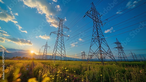 Solar Cells with a High-Voltage Power Line: Solar cells connected to a high-voltage power line, feeding clean energy into the grid.
