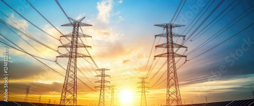 Solar Panels and Wind Turbines at Sunset for Renewable Energy Concept