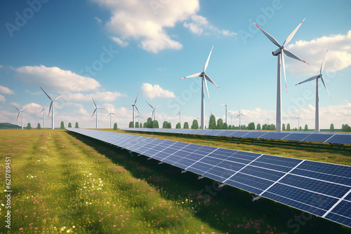 Solar panels and wind turbines illustration, symbolizing the renewable energy revolution and our collective commitment to a greener and cleaner world. Ai generated