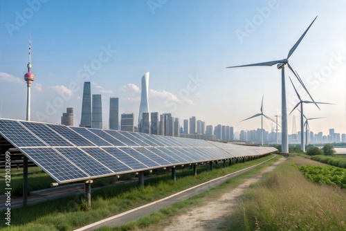 solar energy, wind turbine, renewable energy, city, skyscraper, alternative energy, clean energy, sustainability, urban, environment, technology, energy, power generation, environmentally friendly, green energy, solar panel, wind farm, china, blue skies, grass, path, tower
