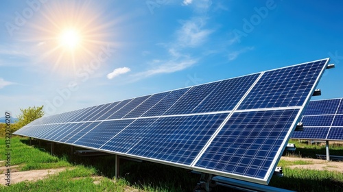 Solar Panels Catching Sunlight in a Clear Blue Sky with Green Grass Underneath