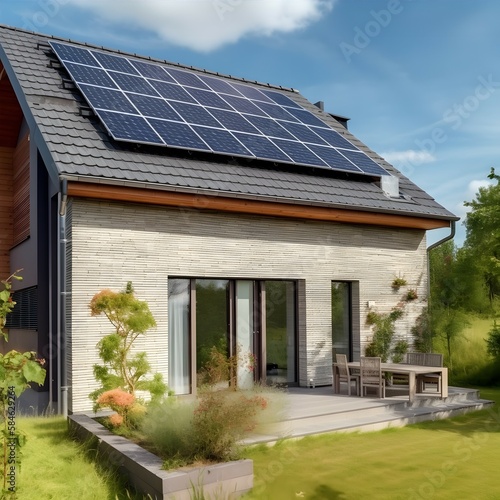 Solar panels on a gable roof. Beautiful, large modern house and solar energy created with Generative AI technology.