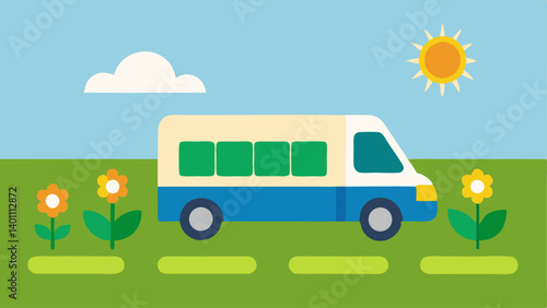SolarPowered Delivery Van A delivery van with solar panels on its roof driving along a road beside a flowerfilled meadow symbolizing sustainable transportation.