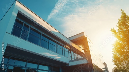 Solar-Powered Factory with Photovoltaic Roof Panels Industrial solar-powered factory, in the context of solar power production, modern architecture, clean design, bright daylight, wide-angle.