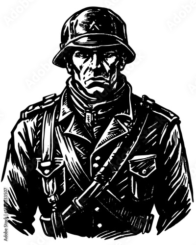 soldier, vector, illustration, warrior, military, armed forces, helmet, armoring, rifle, spear, shield, combat, black-and-white, engraving, detailed, artistic, traditional, heroic, classical, epic, historical, strong, digital artwork, minimalistic, silhouette, dramatic, intimidating, decorative, textured, vintage, tactical, fearless, iconic, war, defense, bravery, stoic, army, person, gun, uniform, people