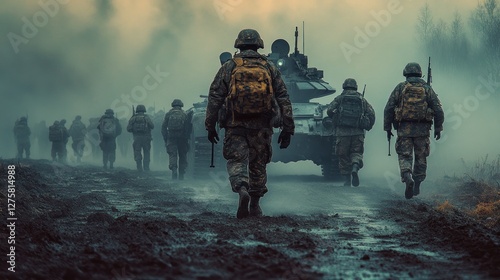 soldier, army, military, war, battlefield, fog, combat, tank, weapon, marching, camouflage, conflict, troop, infantry, defense, security, battle, warfare, fighting, equipment, vehicle, landscape, road, mud, ground, atmosphere, scene, action, movement, grey, dark, cold, winter, mist, grim
