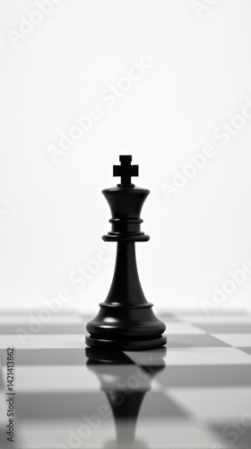 Solitary Black Chess King Standing on a Checkered Board with Dramatic Lighting in Monochrome