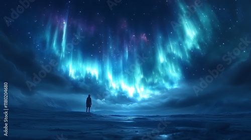 aurora, borealis, night, sky, star, person, alone, landscape, cold, winter, dark, mysterious, magical, wonder, awe, amazement, beautiful, scenic, nature, arctic, polar, light, colours, vibrant, blue, green, purple, silhouette, horizon, huge, space, cosmic, celestial, fantasy, dreamlike, serene, peaceful, solitude, exploration, adventure, travel, remote, quiet, stillness, mystery