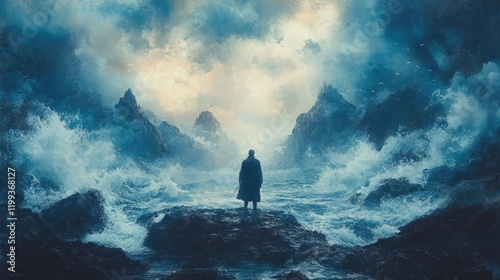 ocean, wave, storm, man, figure, coat, rock, cliff, mountain, sky, cloud, dramatic, moody, atmospheric, fantasy, mystical, surreal, lonely, isolated, desolate, huge, powerful, intense, brooding, mysterious, adventure, journey, solitude, contemplation, hope