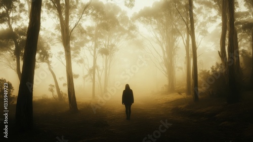 Solitary Figure Walking through a Foggy Forest at Dusk