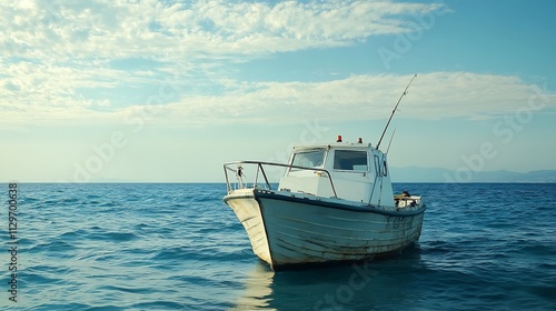 boat, fishing, sea, ocean, water, sky, cloud, calm, tranquil, summer, horizon, blue, white, vessel, small, alone, solitary, peaceful, serene, daytime, sun, light, nature, landscape, travel, coast, view, scene, image, photo, picture, background, wave, fishing pole, marin, aquatic, ship, craft, floating, leisure, relaxing, beautiful