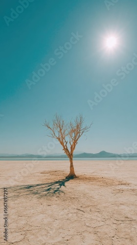 Solitary, leafless tree casts shadow on a flat, pale desert under a bright sun and clear sky
