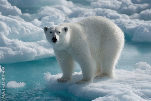 Solitary polar bear stands on melting ice in the Arctic showcasing the impact of climate change on wildlife