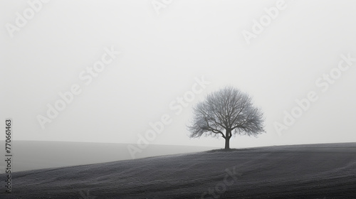 Solitary Tree on Misty Hill Minimalist Landscape Photography