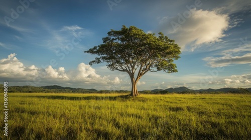 tree, meadow, field, grass, sky, cloud, landscape, nature, scenery, dusk, dawn, sunlight, sunshine, gold, tranquil, serene, peaceful, calm, solitude, isolated, alone, environment, rural, country, countryside, horizon, hill, forest, wood, green, yellow, blue, white, scenic, nobody, exterior, outdoors, vista, pasture, plain