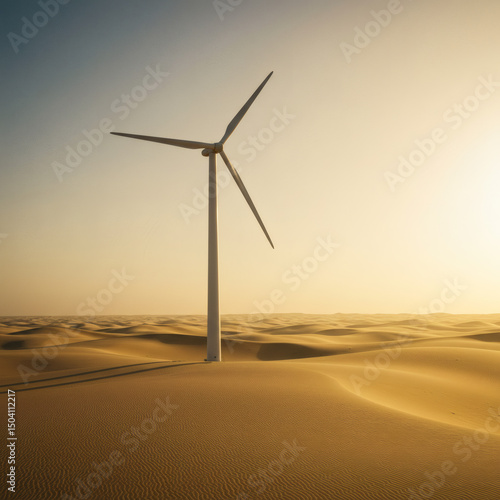 Solitary wind turbine standing in a vast desert landscape with sand dunes at sunset. Represents renewable energy generation and sustainable power in arid regions.